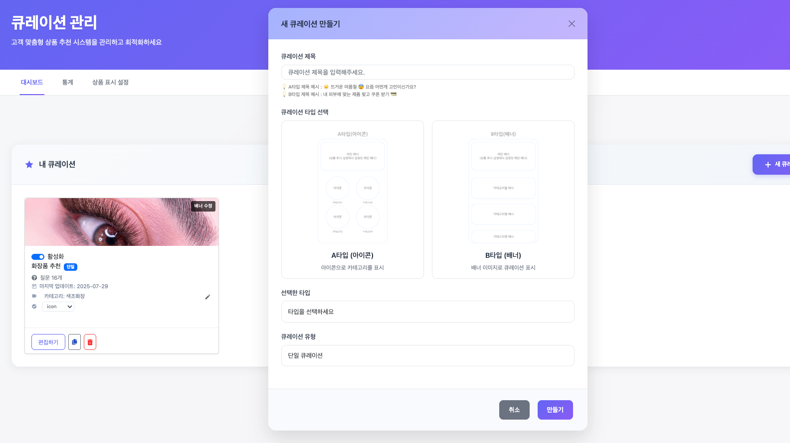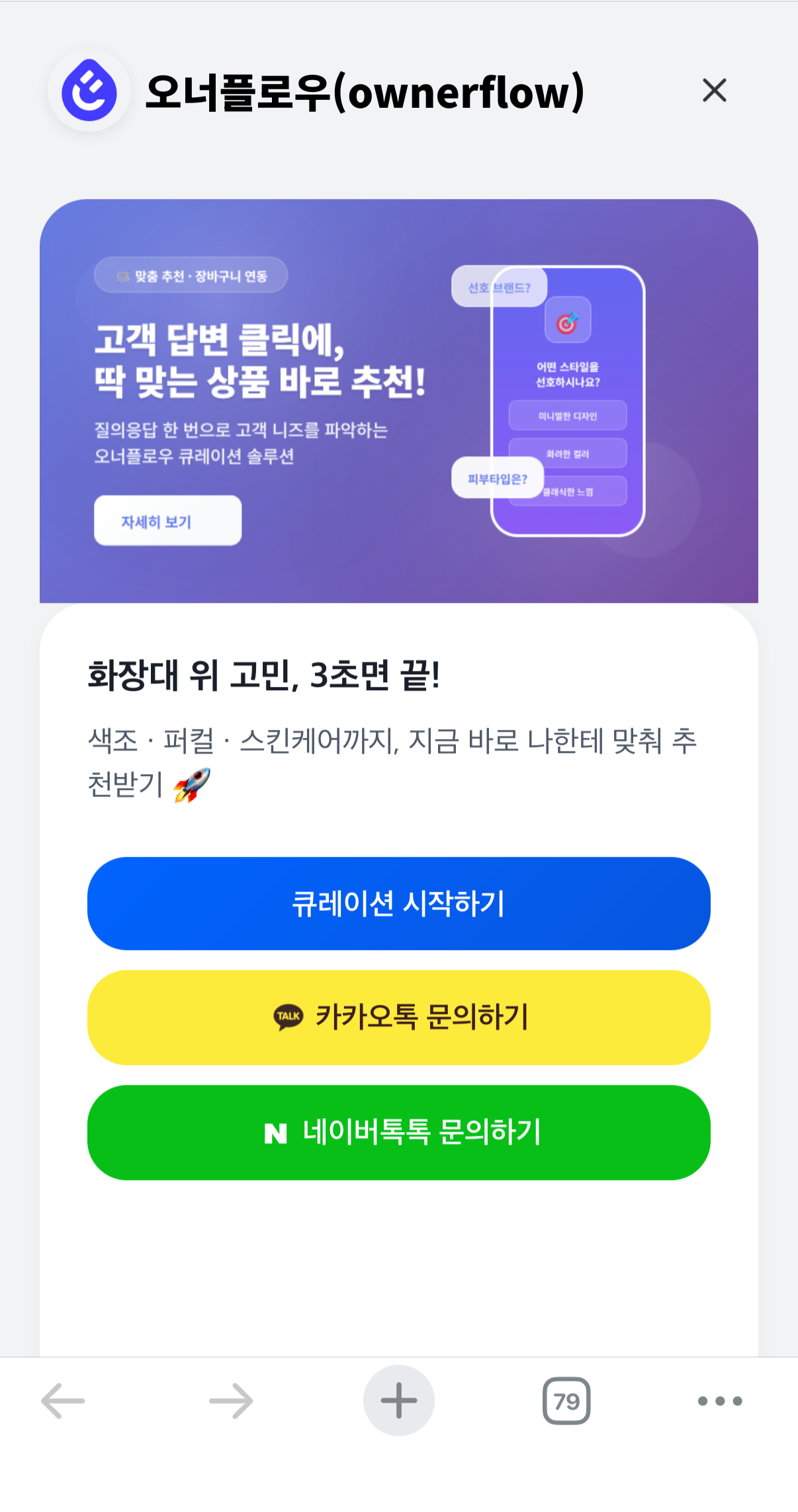 개별 상담 없는 자동화된 맞춤 추천 반복적인 고객 문의 대응 없이도 AI 기반 질문 플로우로 정확한 니즈 파악 및 운영 효율 극대화