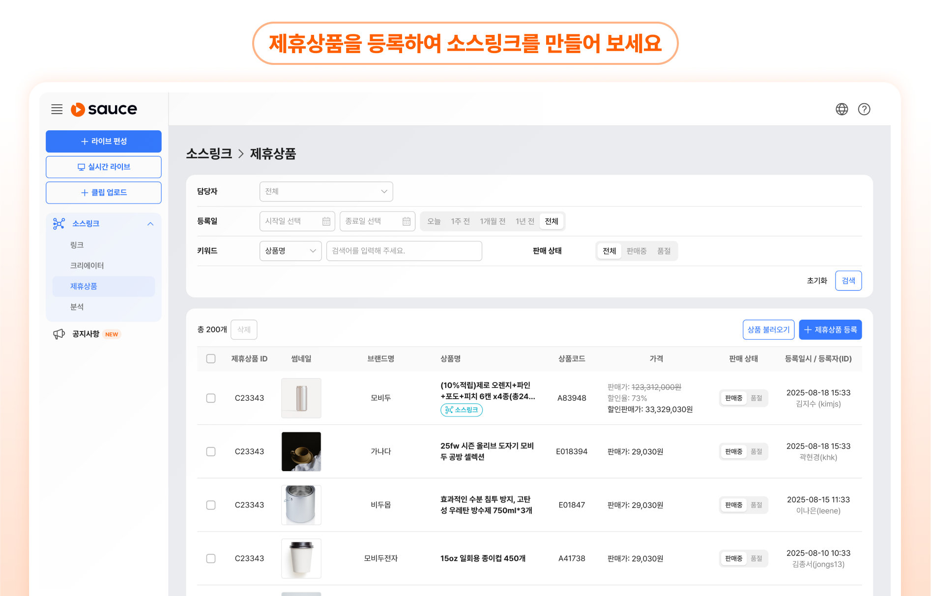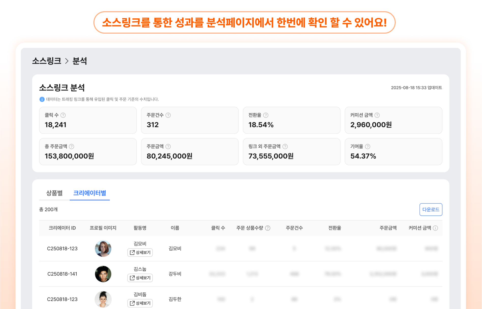 내 상품을 가장 잘 파는 크리에이터가 누구인지, 정확히 보입니다.