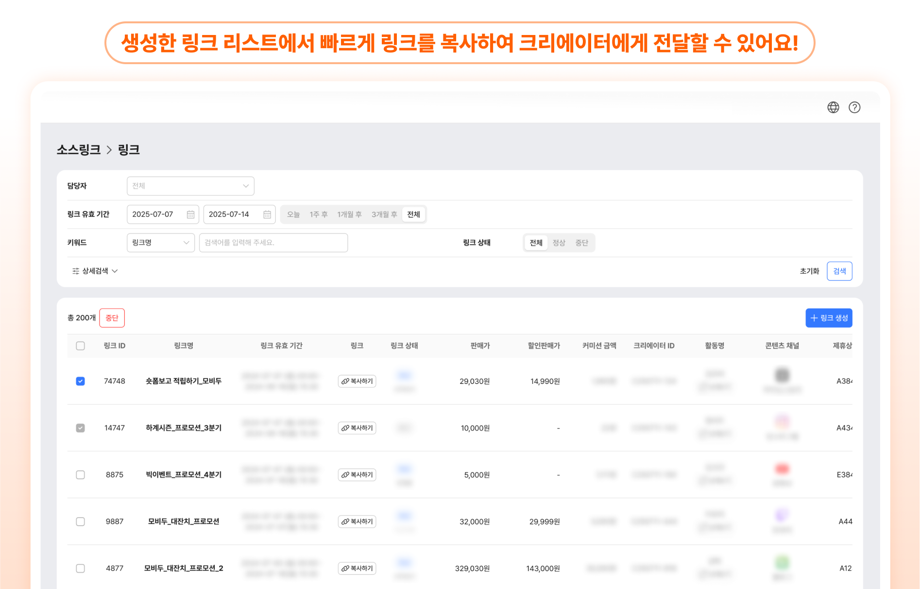 크리에이터 모집부터 링크 생성, 운영, 성과 측정, 정산까지 풀퍼널 원스톱 관리