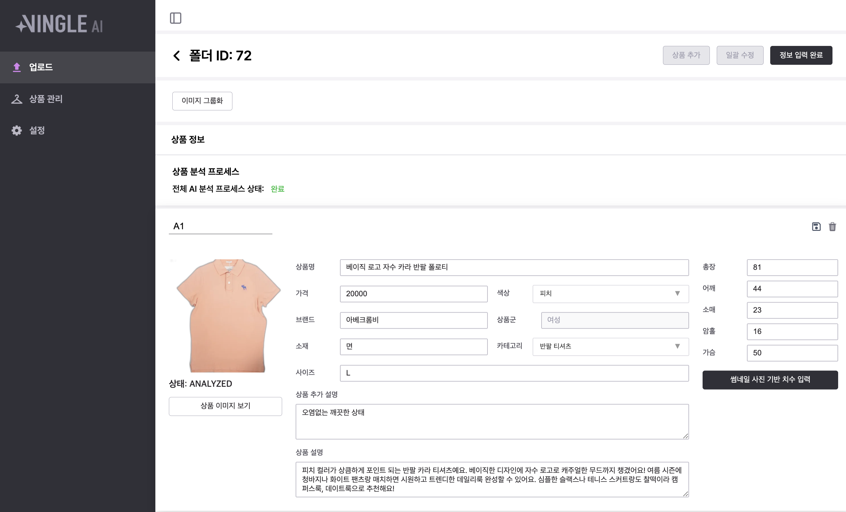 AI가 브랜드, 소재, 상품명, 상품설명을 대신 더 매력적으로 작성해줍니다.