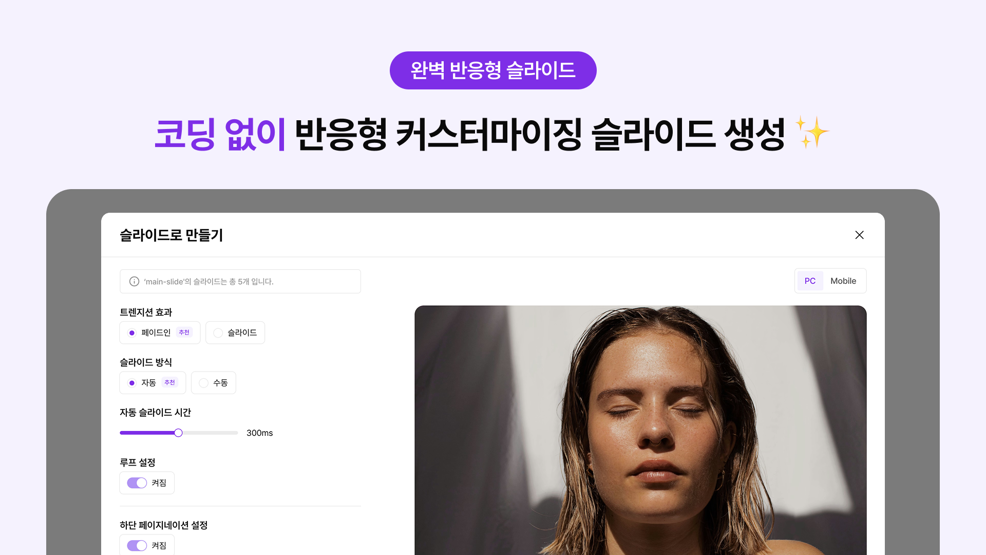 [완벽 반응형 엔진 📱] PC부터 모바일 최적화까지, 코딩 없이도 모든 기기에서 깨짐 없는 유연한 슬라이드 배너를 구현할 수 있어요.