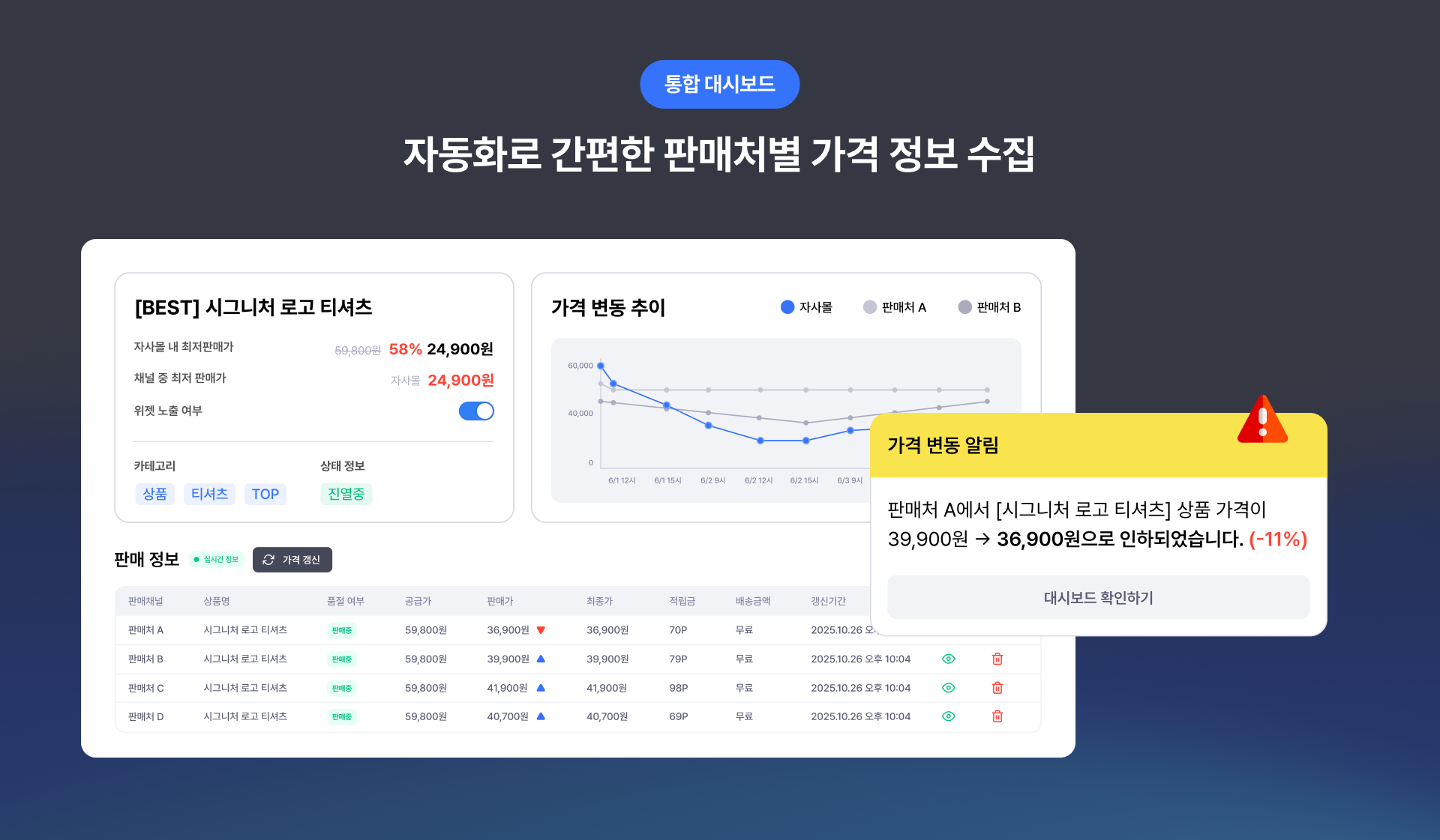 [가격 관리 대시보드] 상품/커머스별 실시간 가격 정보 수집으로 자사몰 마진을 보호하고 가격 변동에 빠르게 대응해요