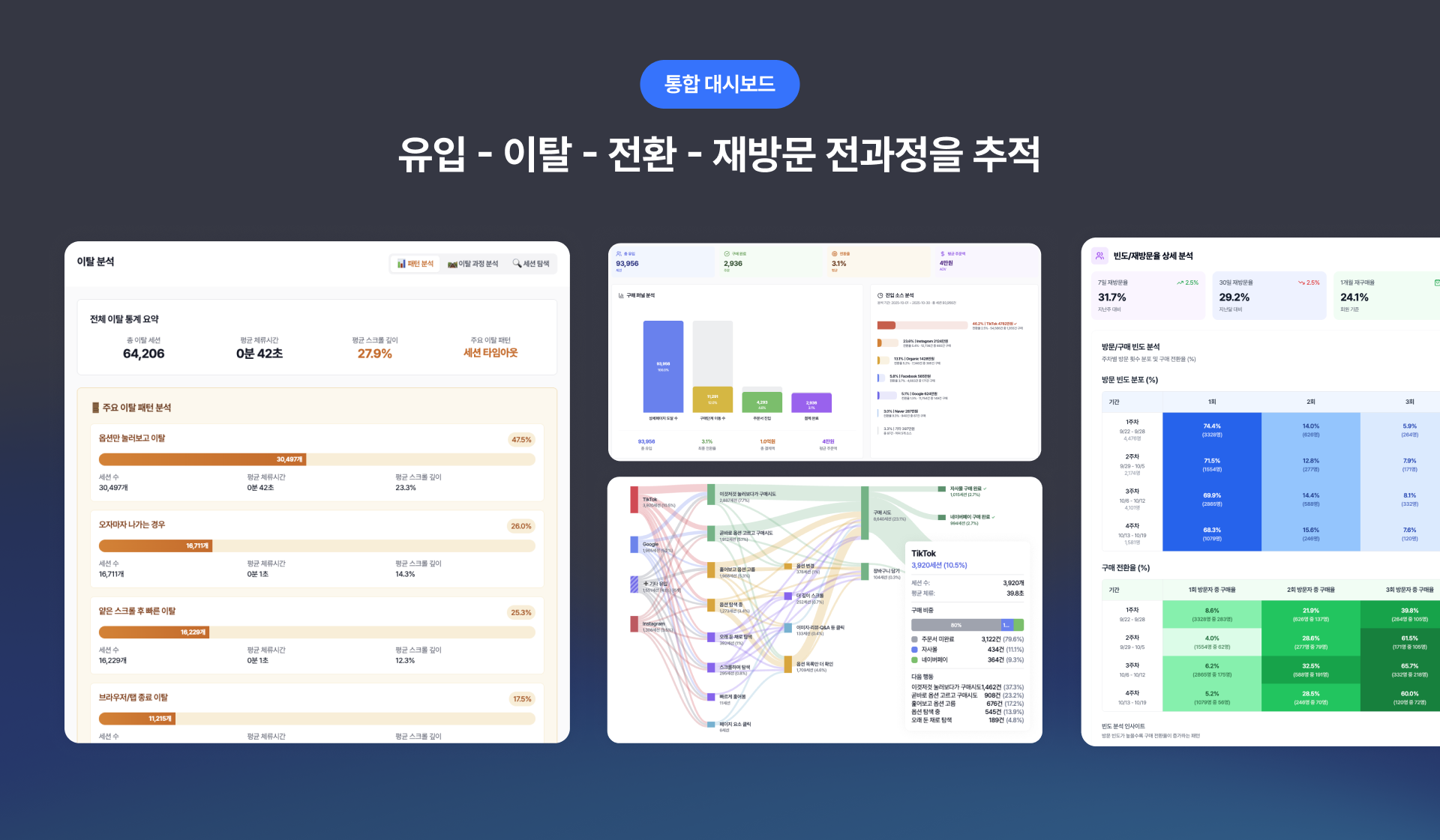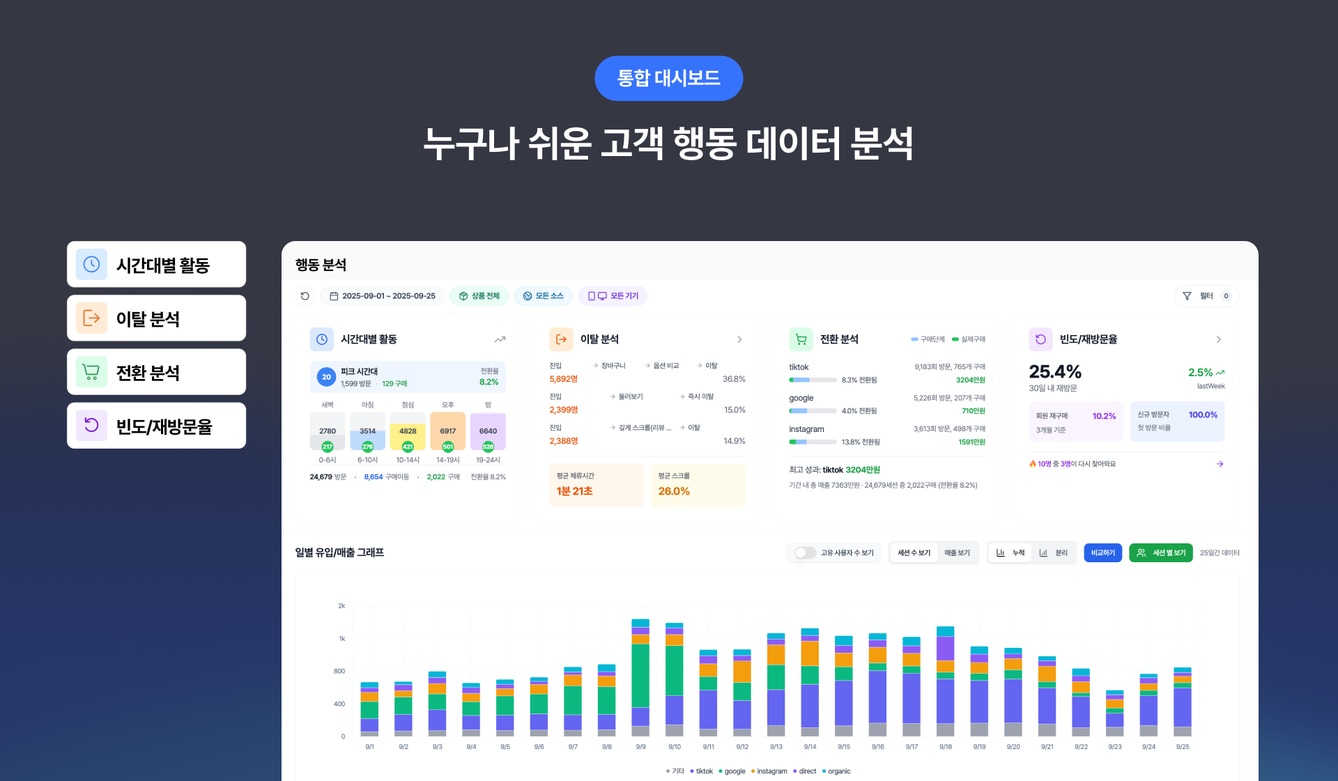 [고객 데이터 대시보드] 직관적인 실시간 고객 행동 데이터 분석으로 상세페이지의 이탈•전환 포인트를 파악해요