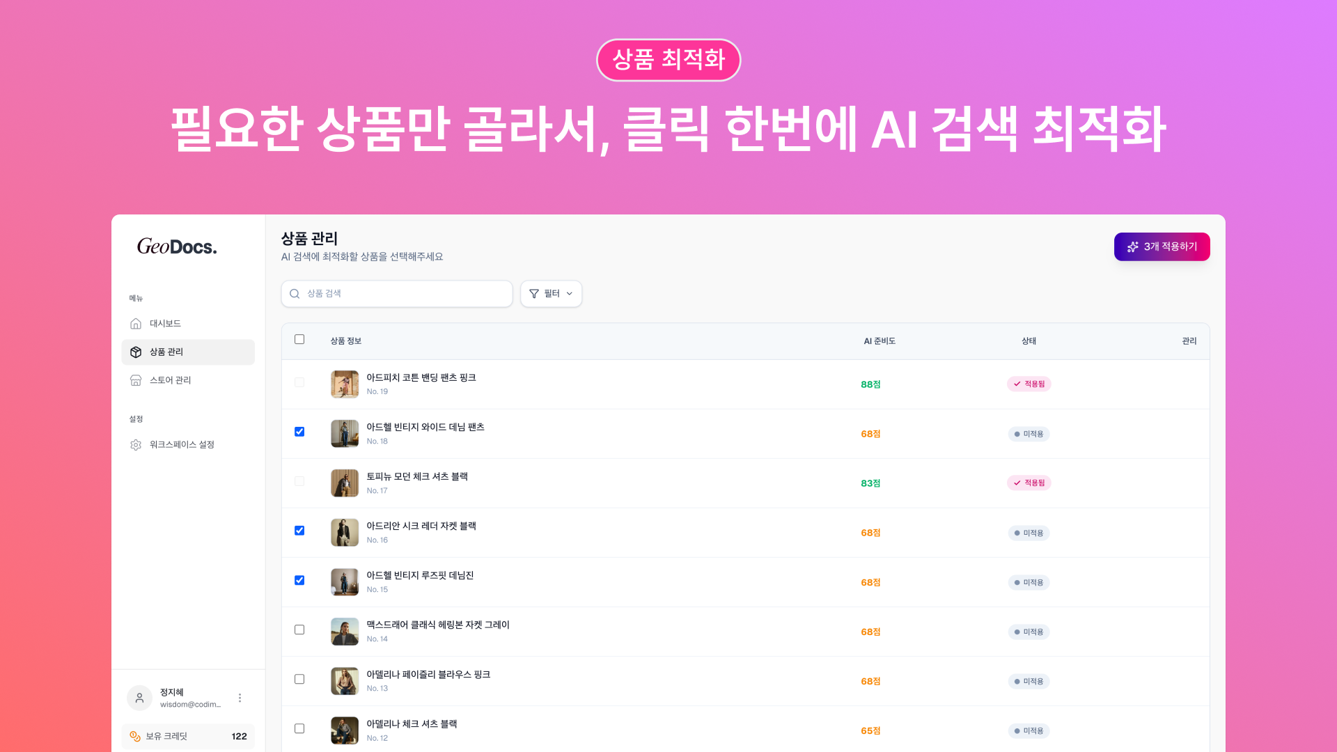 ChatGPT, Gemini 등 AI 검색에서 내 상품이 추천될 확률을 높여줘요.