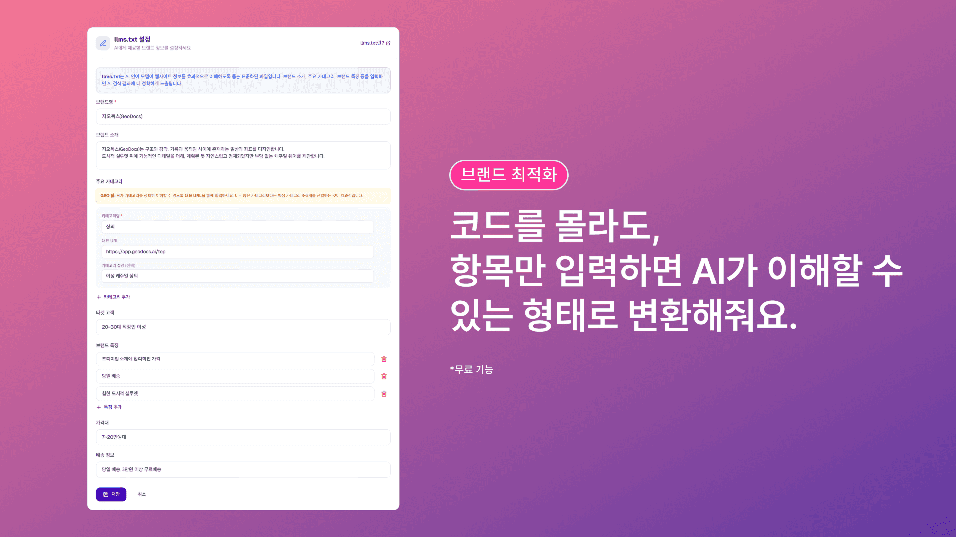 브랜드 특징만 알려주면 AI가 읽을 수 있는 형태로 자동 변환해요.
