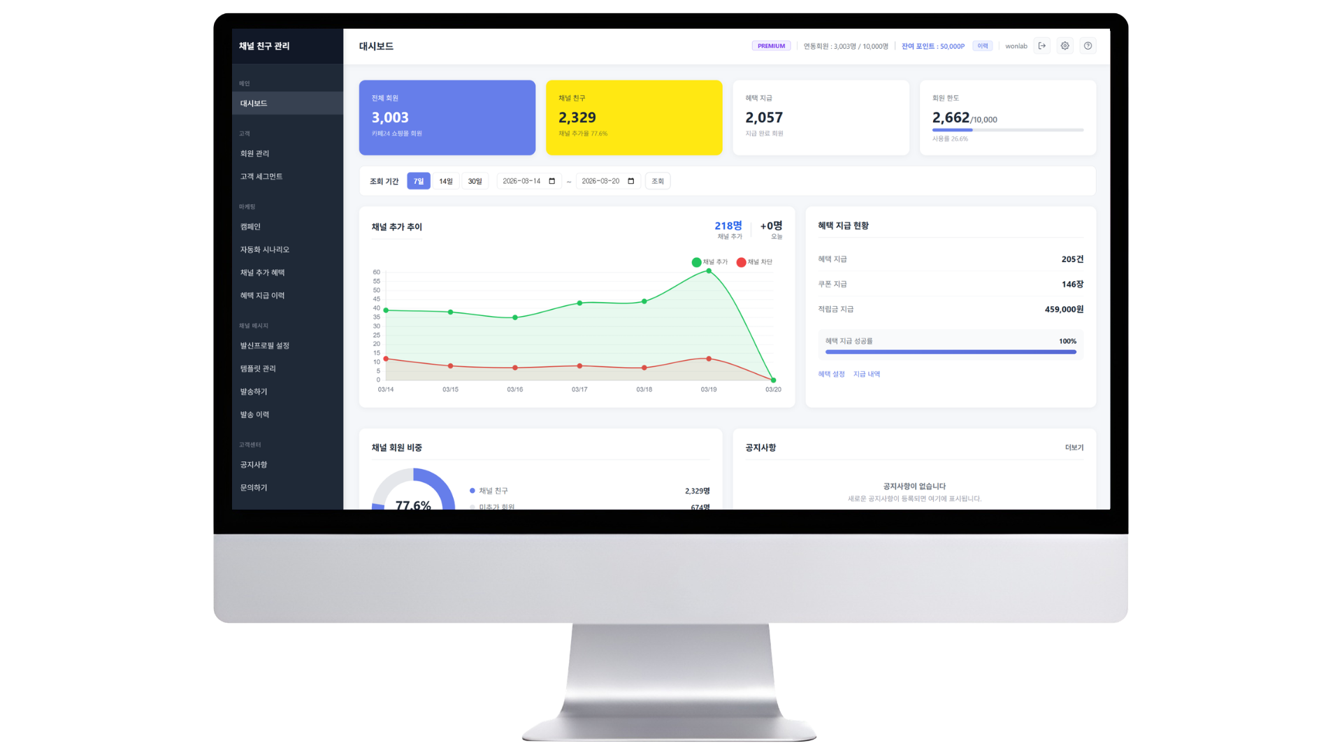카카오 채널 친구 관리 · 자동 혜택 지급 · 타겟 캠페인 · 알림톡 발송 올인원 앱