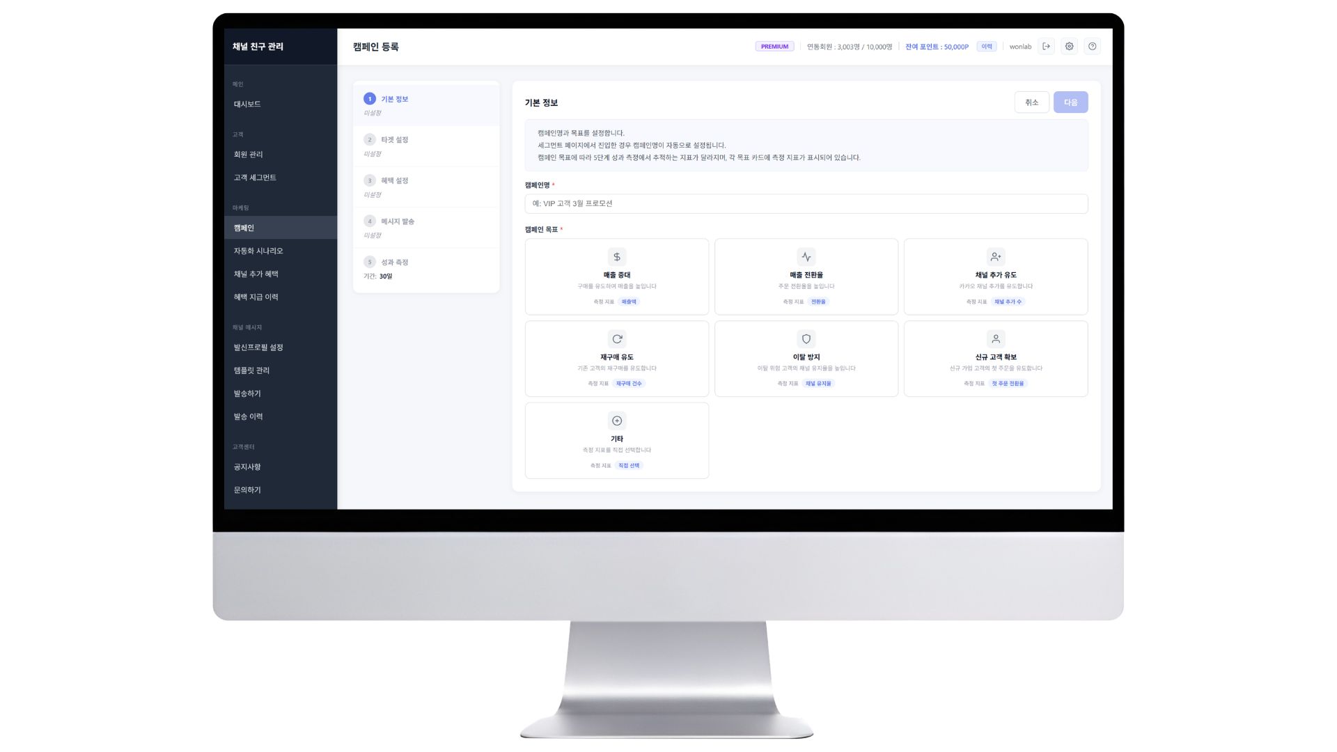구매 이력, 채널 상태 등 조건별로 회원을 자동 분류하고 타겟 캠페인을 실행합니다. 캠페인 전후 매출 증가, 주문 전환율 등 성과 측정도 가능합니다.