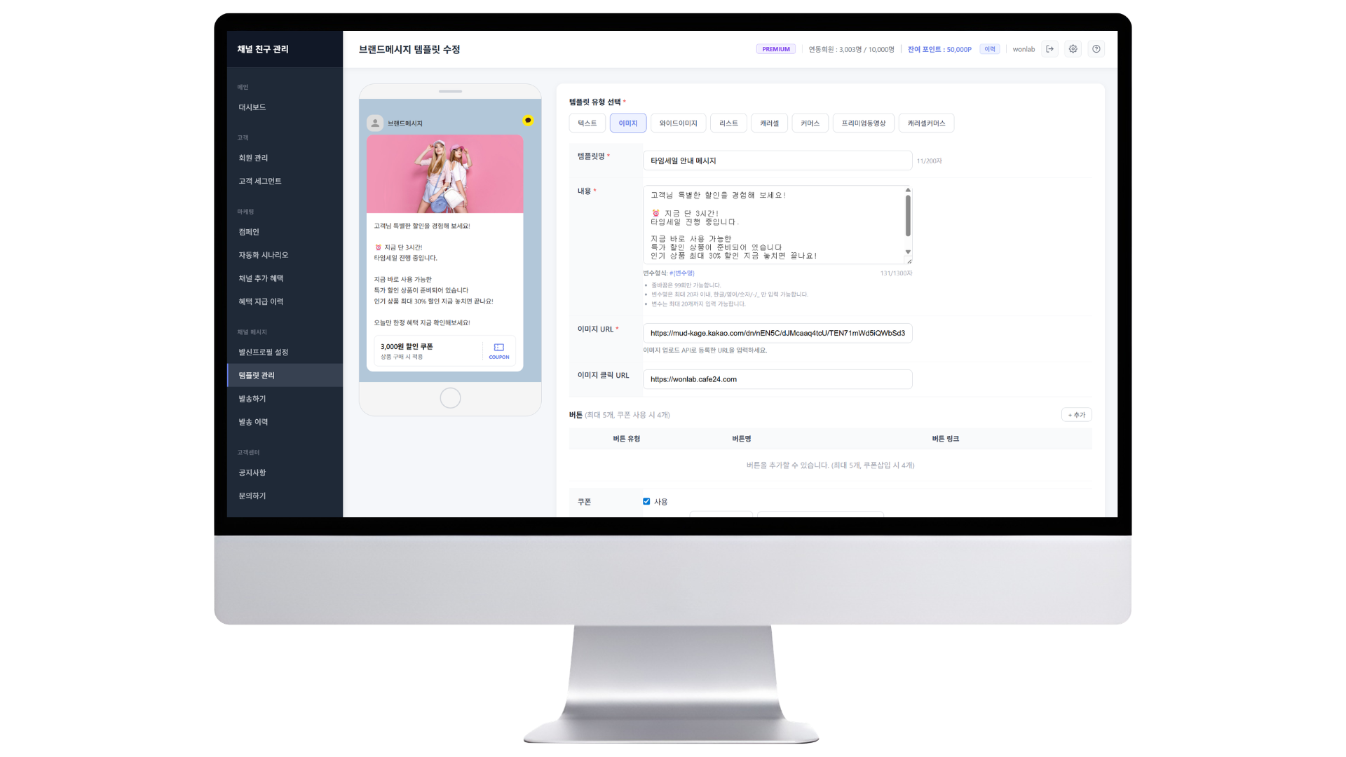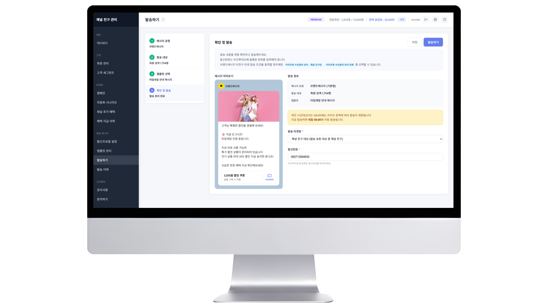 카카오 알림톡 및 브랜드메시지를 쇼핑몰 내에서 직접 발송합니다. 템플릿 관리, 발신 프로필 설정, 야간 자동 예약 발송까지 지원합니다.