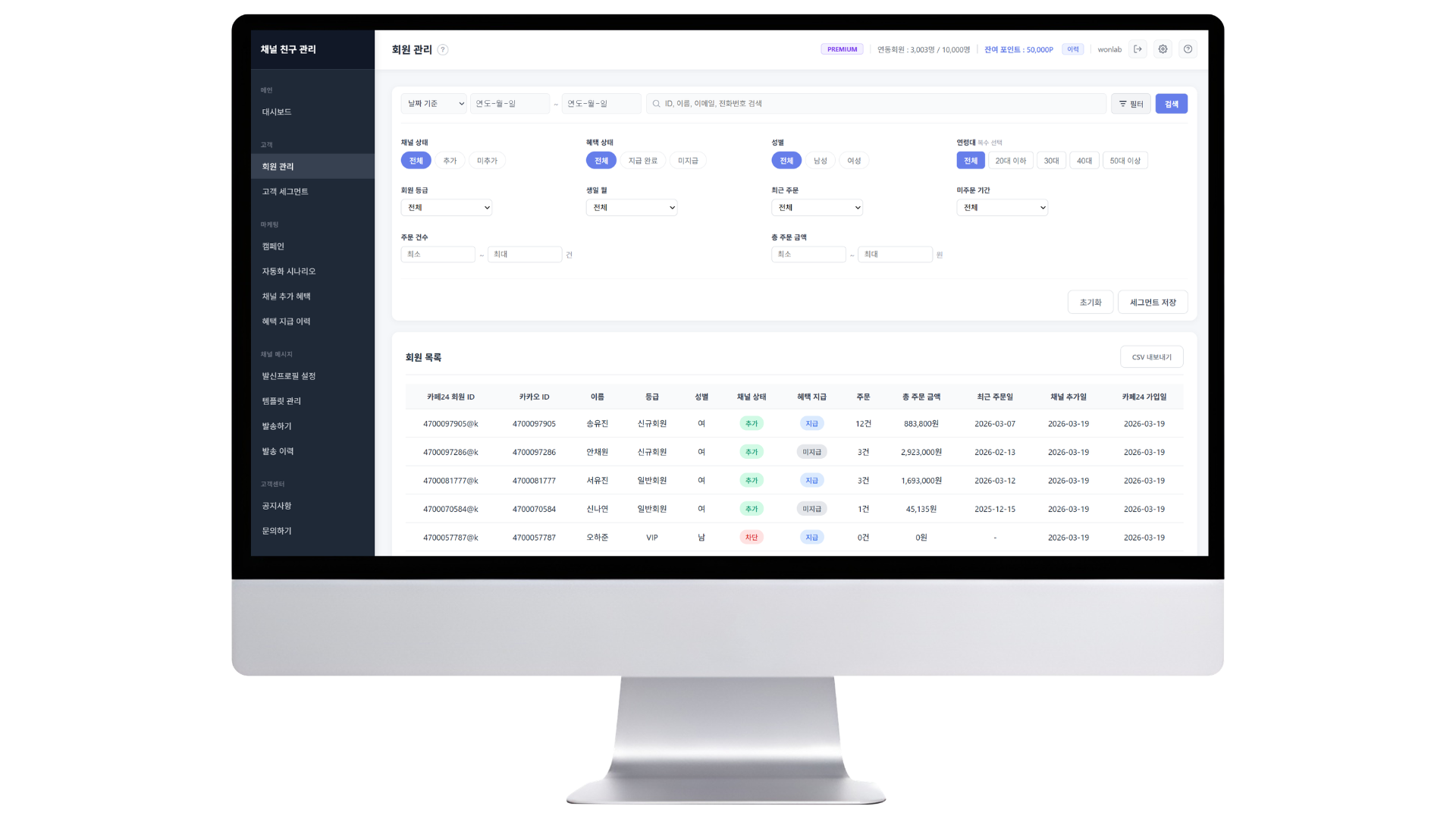 카페24 회원 데이터와 카카오 채널 친구 정보를 하나의 화면에서 통합 관리합니다. 채널 상태, 주문 이력, 성별, 연령대 등 복합 필터 검색을 지원합니다.
