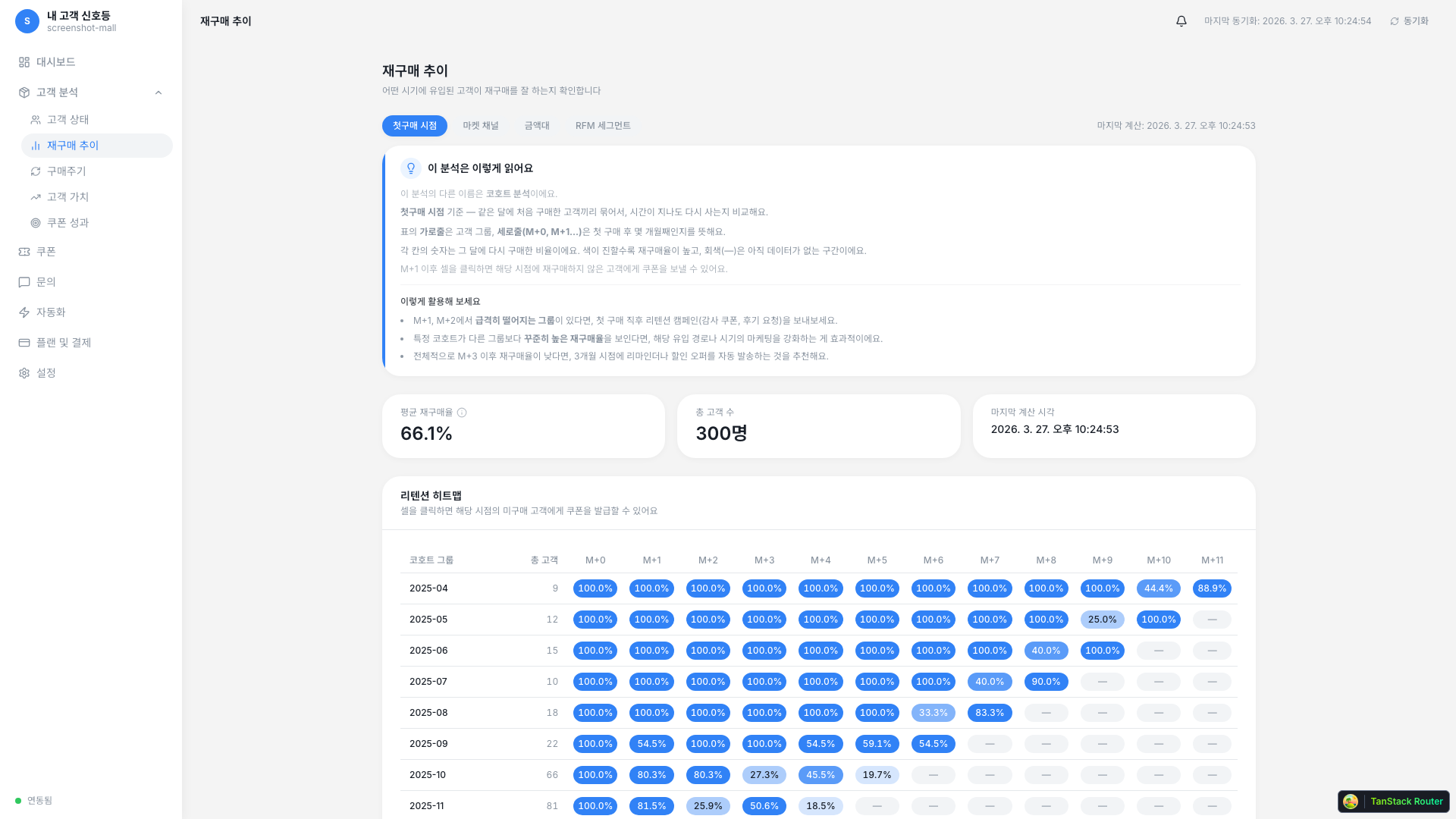주문 데이터 기반 RFM·LTV·코호트·구매주기 분석으로 고객 상태를 다각도로 파악합니다.